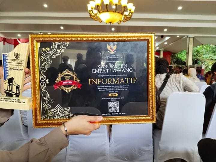 Elangmasnews.com – EMPAT LAWANG – Di bawah kepemimpinan yang konsisten mendorong transparansi dan pelayanan publik berkualitas, Kabupaten Empat Lawang kembali menorehkan prestasi membanggakan. Daerah yang dikenal dengan Bumi Saling Keruani Sangi Kerawati ini resmi meraih predikat Kabupaten Informatif dari Komisi Informasi Provinsi Sumatera Selatan.