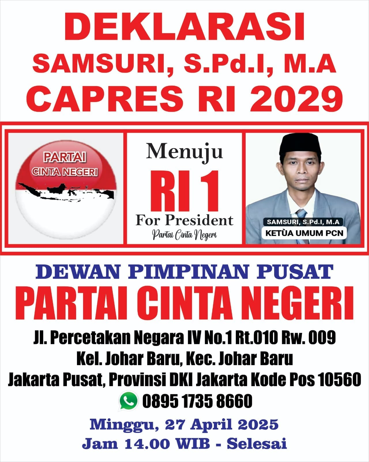 Sosok Pendiri Sekaligus Ketua Umum Partai Cinta Negeri ( Samsuri, S.Pd.I, M.A ) di deklarasikan sebagai Calon Presiden Republik Indonesia untuk Pemilihan Presiden ( pilpres ) 2029 oleh Dewan Pimpinan Pusat Partai Cinta Negeri ( DPP PCN ) yang dibacakan oleh KETUA BIDANG LITBANG DPP PARTAI CINTA NEGERI ( BAPAK SUWARNO ) pada hari minggu, tanggal 27 April 2025 ( pukul : 14.00 WIB – selesai ).