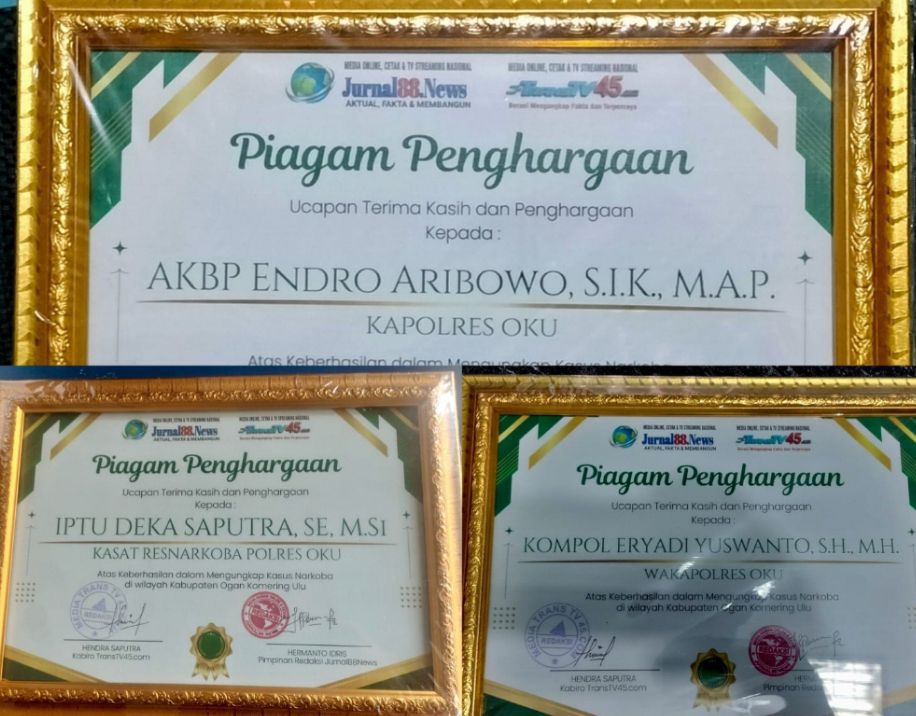 Piagam penghargaan tersebut diserahkan langsung oleh Pimpinan Redaksi (Pimred) Media Jurnal88news Hermanto Idris dan Kabiro OKU Trans TV45.com, Hendra Saputra, kepada Kasat Narkoba Polres OKU Iptu Deka Saputra, S.E., M.Si., yang mewakili Kapolres dan Waka Polres OKU. Jumat (19/09/2025).