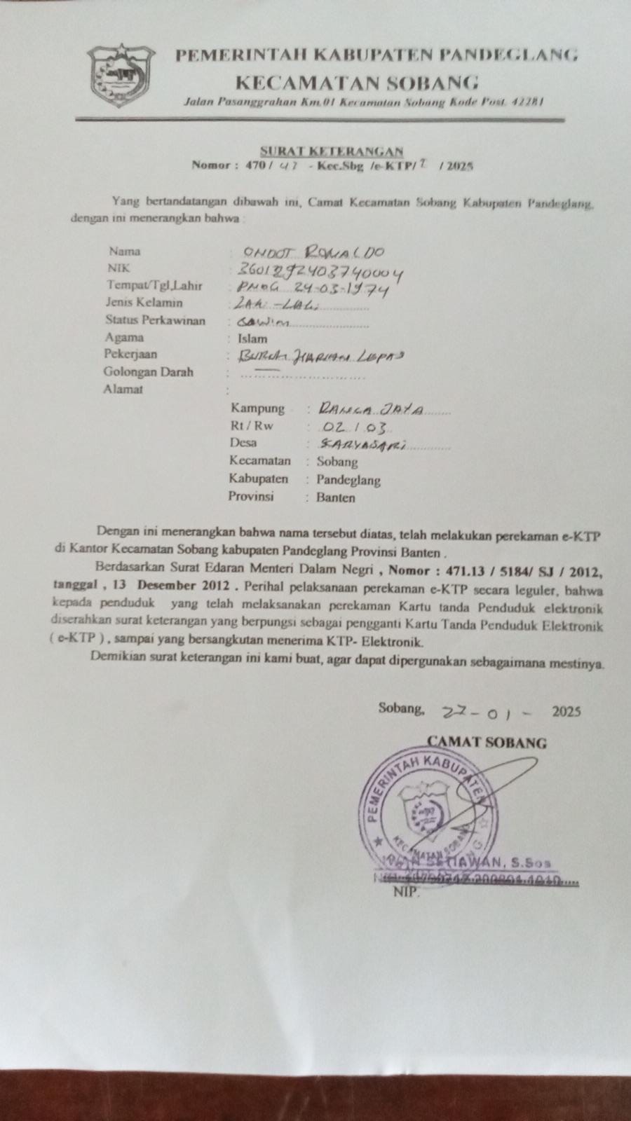 Elangmasnews.com, Pandeglang — Bukan sedang syuting atau pencitraan, melainkan panggilan hati yang mengedepankan nilai kemanusiaan. Seorang warga Kampung Banteng, Desa Bojen, Kecamatan Sobang, yang tengah sakit dan belum memiliki KTP, mendapatkan pelayanan perekaman e-KTP langsung di rumahnya.