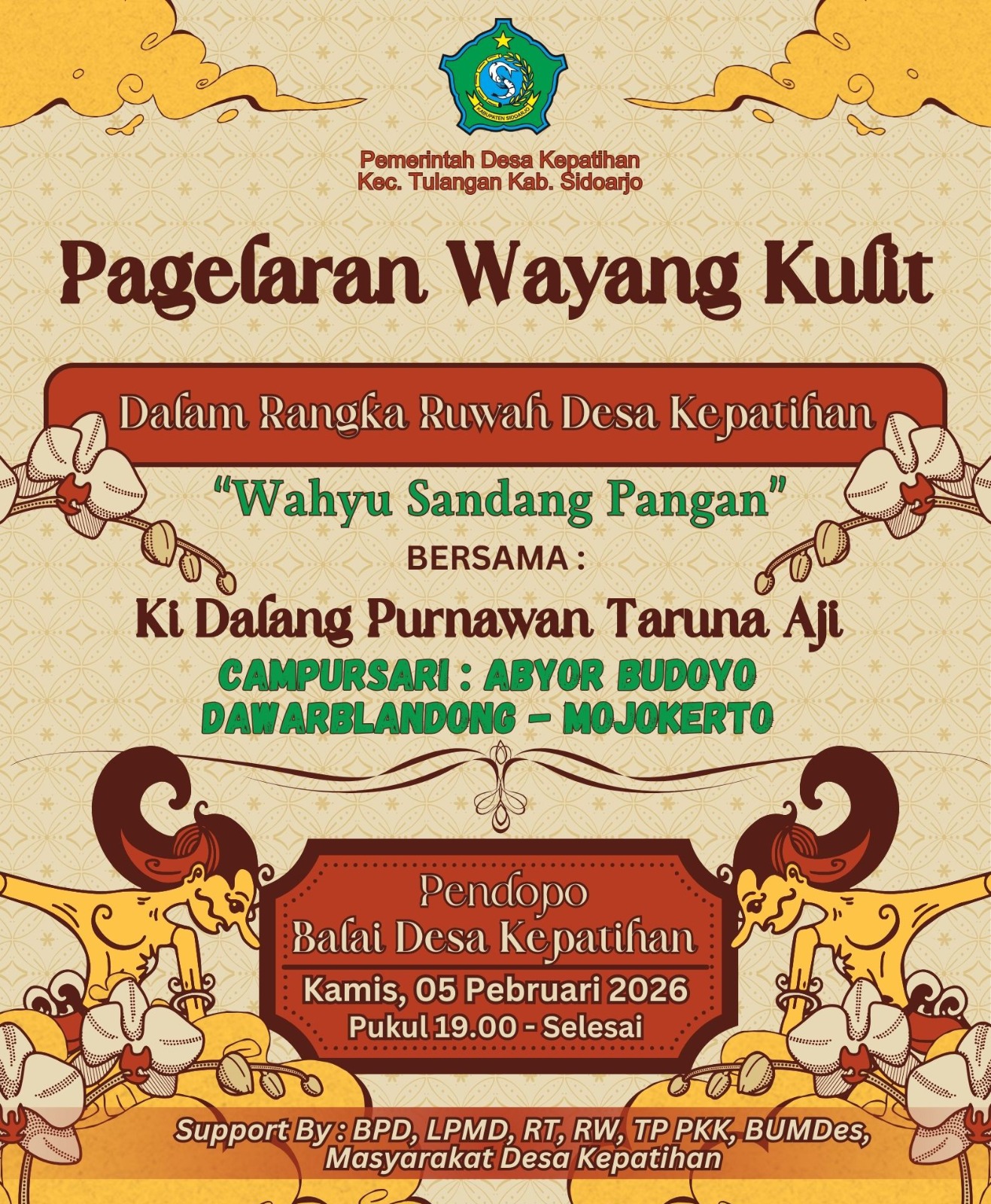 Agar tidak di lupakan dari generasi berikutnya. Dan seni ini budaya ini wayang kulit dan campur sari ajar Ki mbahu rekso atau Ki dayang Pedayangan desa patihan mbh pateh mbh bakal mbh kunti. Iku merasakan tradisi atau sesembahan dari turun menurun hari kamis tgl 05/02/2026 kepala desa yang gagah perkasa yang di pimpin oleh (BPK rigo putrama) selama ini sejatra dan damai makmur masyarakatnya.