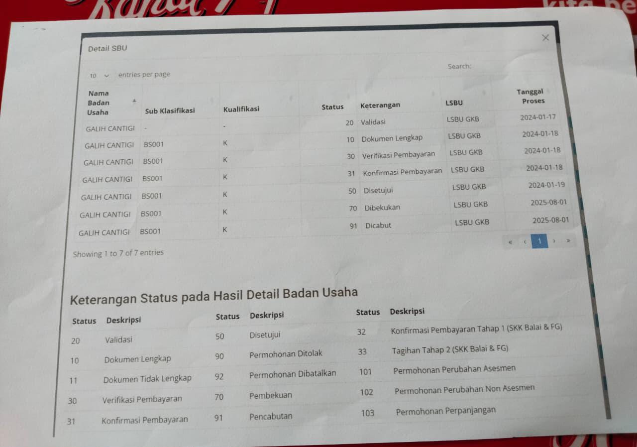 Ia menjelaskan bahwa CV. Galih Cantigi sebagai pemenang kontrak memiliki SBU yang sah dan berlaku hingga 2027 saat proses penandatanganan kontrak pada 14 April 2025.