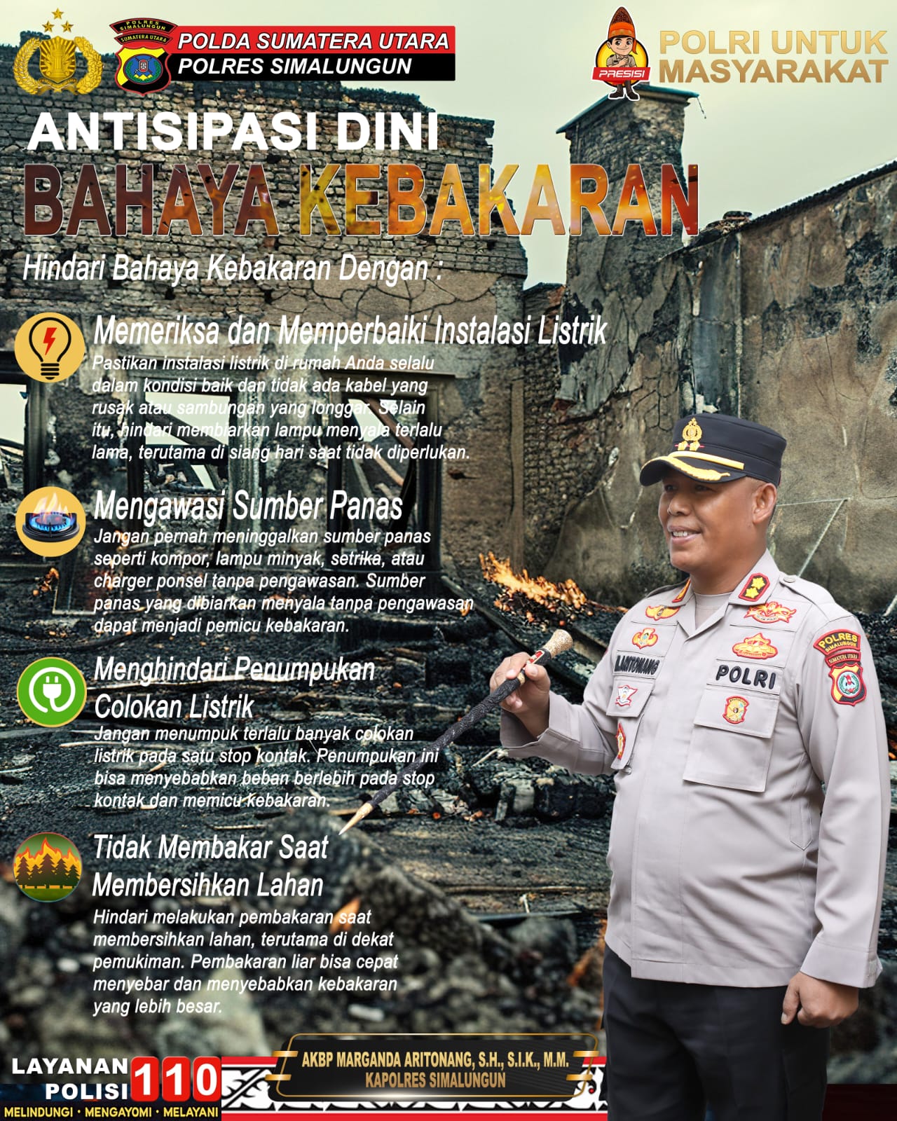 Jika terjadi kebakaran, Kapolres memberikan instruksi tegas. “Segera hubungi 110 atau pemadam kebakaran. Jangan panik dan prioritaskan keselamatan jiwa. Barang bisa dicari lagi, tapi nyawa tidak bisa diganti,” kata AKBP Marganda memberikan arahan darurat.