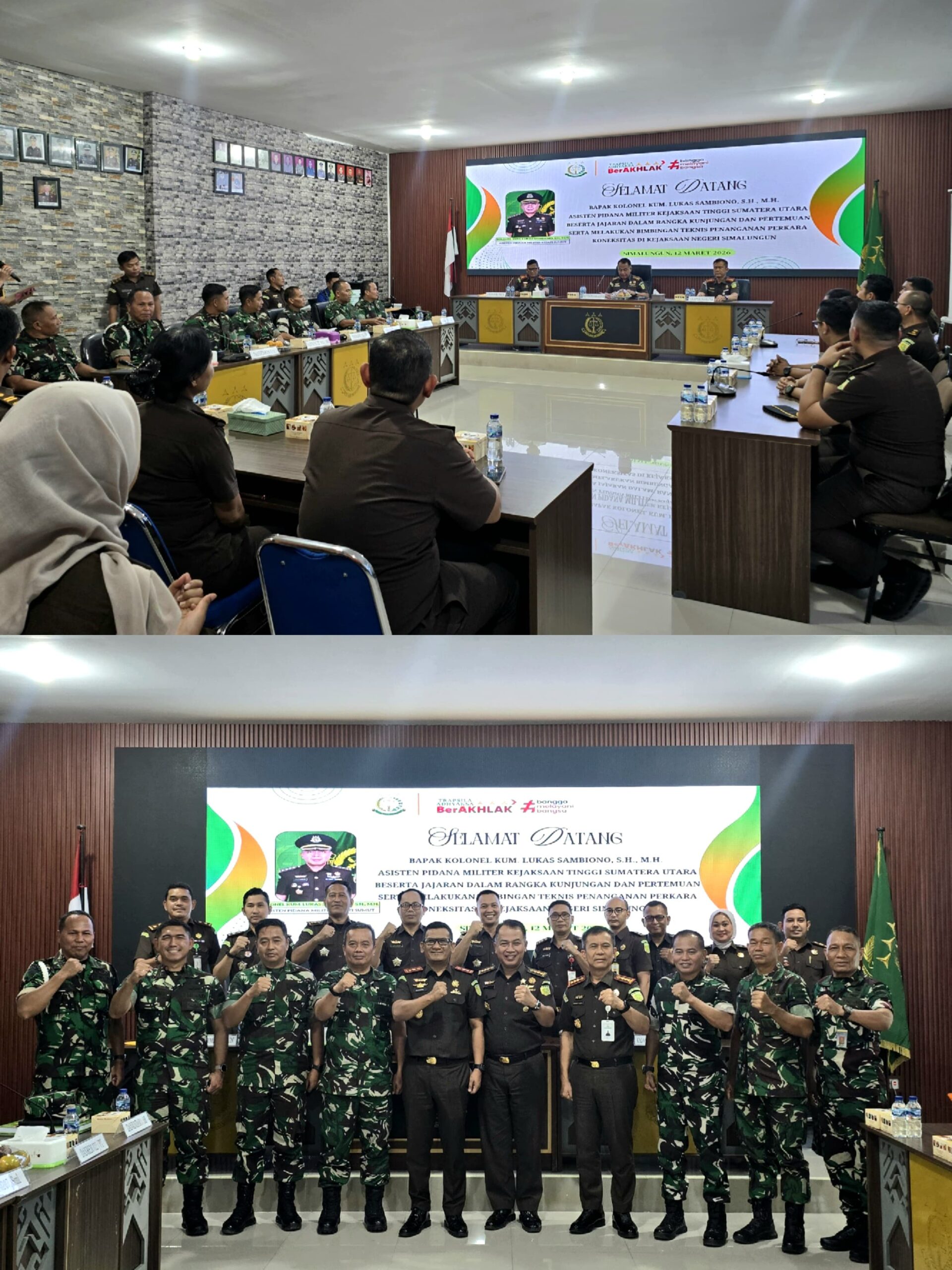 Elangmasnews.com, Simalungun, 12 Maret 2026 — Kepala Kejaksaan Negeri (Kajari) Simalungun menerima kunjungan kerja Asisten Pidana Militer (Aspidmil) Kejaksaan Tinggi Sumatera Utara, Kolonel Kum Lukas Sambiono, SH., MH beserta jajaran, Kamis (12/3/2026). Kunjungan tersebut dilaksanakan dalam rangka kegiatan Bimbingan Teknis Penanganan Perkara Koneksitas di wilayah hukum Kejari Simalungun.
