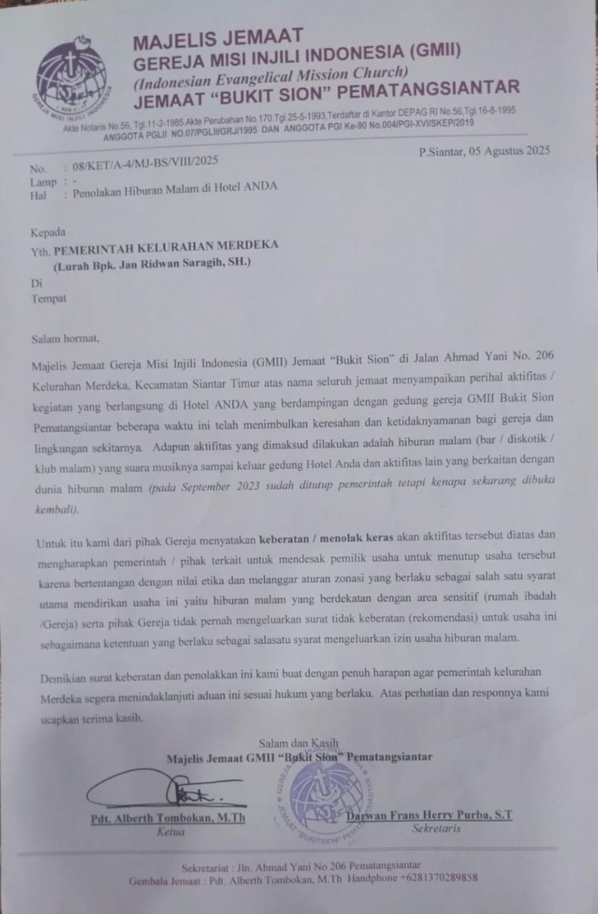 Surat pertama tertanggal 5 Agustus 2025 ditujukan kepada Pemerintah Kelurahan Merdeka, Kecamatan Siantar Timur, sementara surat kedua tertanggal 6 Oktober 2025 dikirim langsung kepada Wali Kota Pematangsiantar, Bapak Wesly Silalahi, SH., MKn. Dalam kedua surat itu, Majelis Jemaat GMII Bukit Sion dengan tegas menyampaikan keberatan terhadap kegiatan hiburan malam berupa bar, diskotik, dan karaoke di Tempat Hiburan Malam Anda Karaoke yang suaranya terdengar hingga ke area gereja. Aktivitas tersebut dinilai tidak pantas karena berdampingan langsung dengan rumah ibadah dan melanggar etika sosial serta aturan pemerintah terkait zonasi tempat usaha.