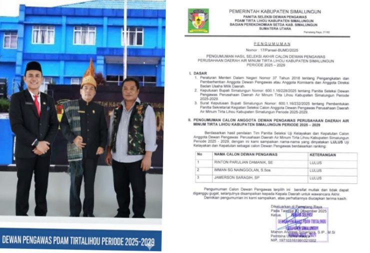 Elangmasnews.com,Simalungun- Pemerintah Kabupaten Simalungun, Sumatera Utara, melalui Panitia Seleksi Badan Usaha Milik Daerah (BUMD), resmi mengumumkan hasil seleksi akhir Dewan Pengawas PDAM Tirta Lihou periode 2025–2029. Pengumuman yang tertuang dalam surat bernomor 17/Pansel-BUMD/2025 tersebut ditandatangani oleh Ketua Pansel, Mixon Andreas Simamora, yang juga menjabat Sekretaris Daerah Kabupaten Simalungun.