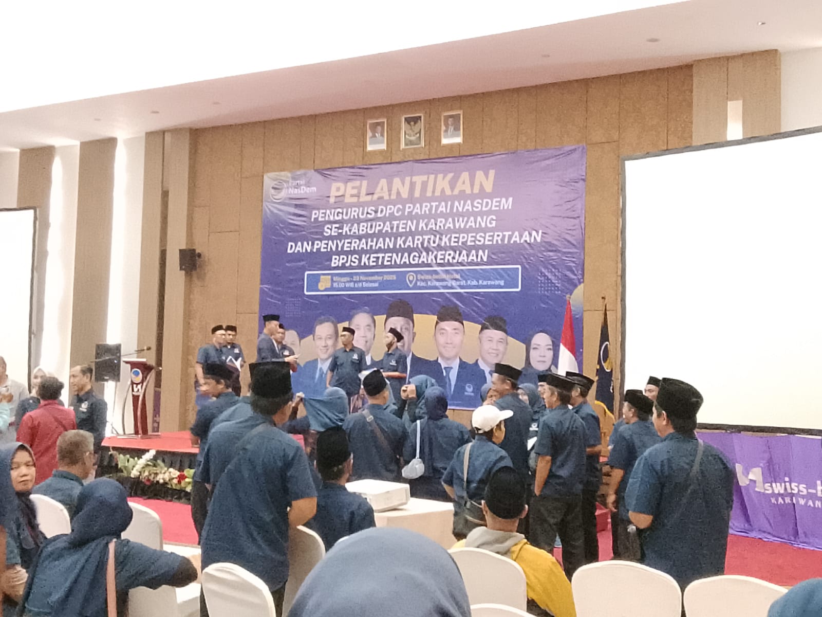 Karawang — elangmasnews.com,- Dewan Pimpinan Daerah (DPD) Partai NasDem Kabupaten Karawang resmi melantik pengurus Dewan Pimpinan Cabang (DPC) se-Kabupaten Karawang dalam sebuah acara yang berlangsung di Hotel Swiss-Belinn Karawang Barat, Minggu. Kegiatan tersebut dihadiri ratusan kader, simpatisan, serta tokoh politik daerah, menjadikan suasana pelantikan berlangsung meriah.