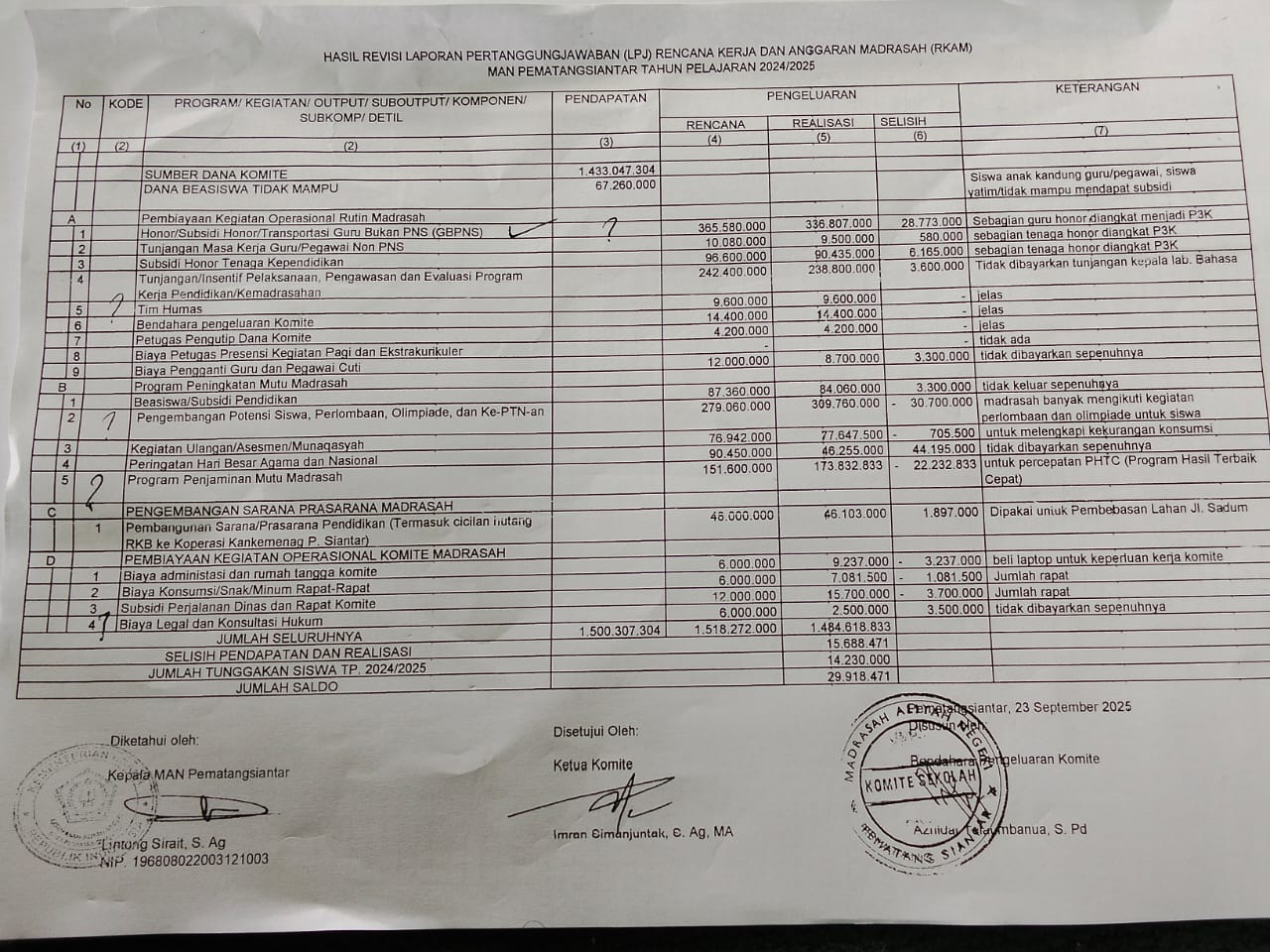 Dalam laporan tertulis yang dibagikan pihak sekolah, disebutkan bahwa total dana yang dikelola selama tahun ajaran 2024–2025 mencapai Rp 3,64 miliar, terdiri dari Dana BOS dan DIPA APBN sebesar Rp 1,725 miliar serta dana komite hasil iuran orang tua siswa sebesar Rp 1,547 miliar dari total 1.150 siswa kelas X, XI, dan XII.