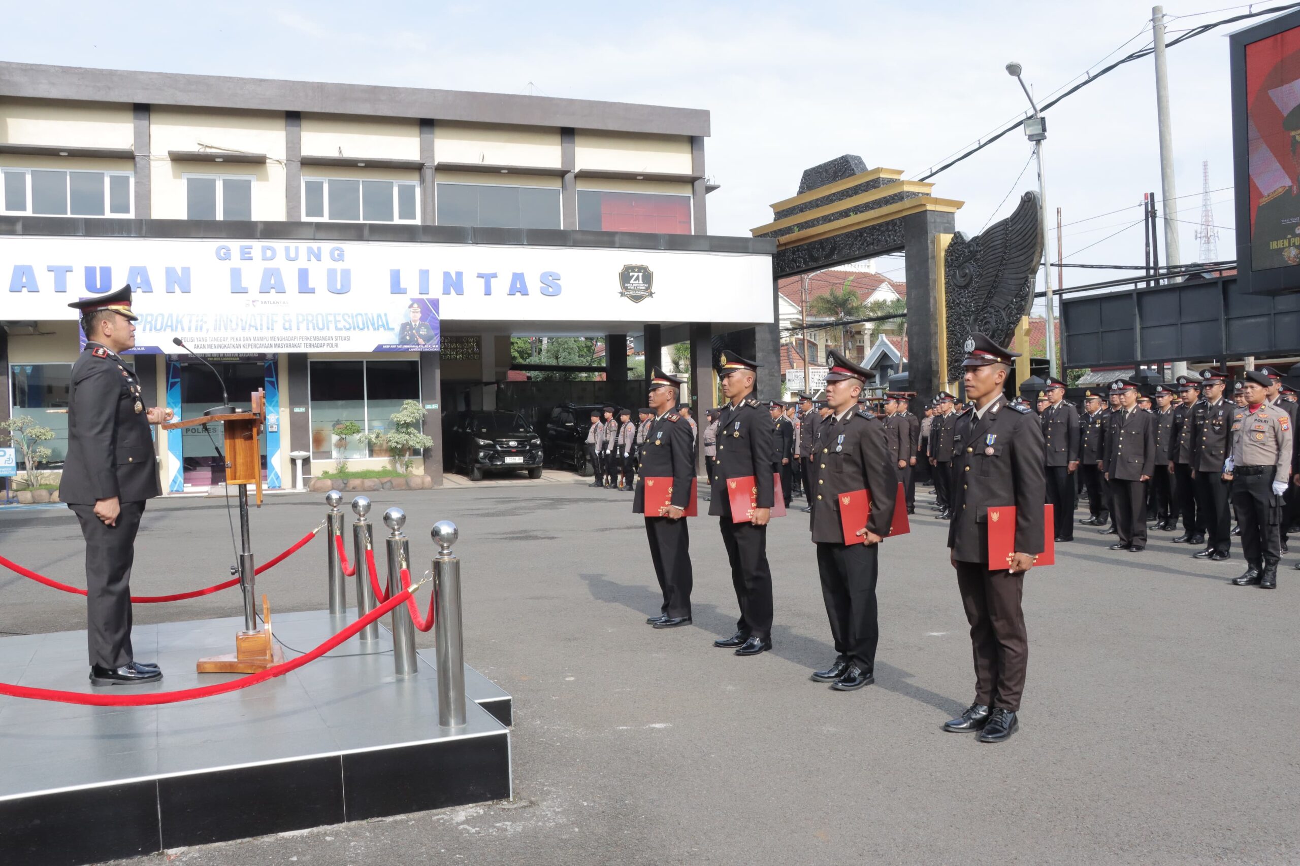 Upacara penganugerahan berlangsung tertib dan penuh khidmat sebagai momentum untuk memperkuat komitmen seluruh personel Polres Lamongan dalam mengabdi kepada bangsa dan negara.