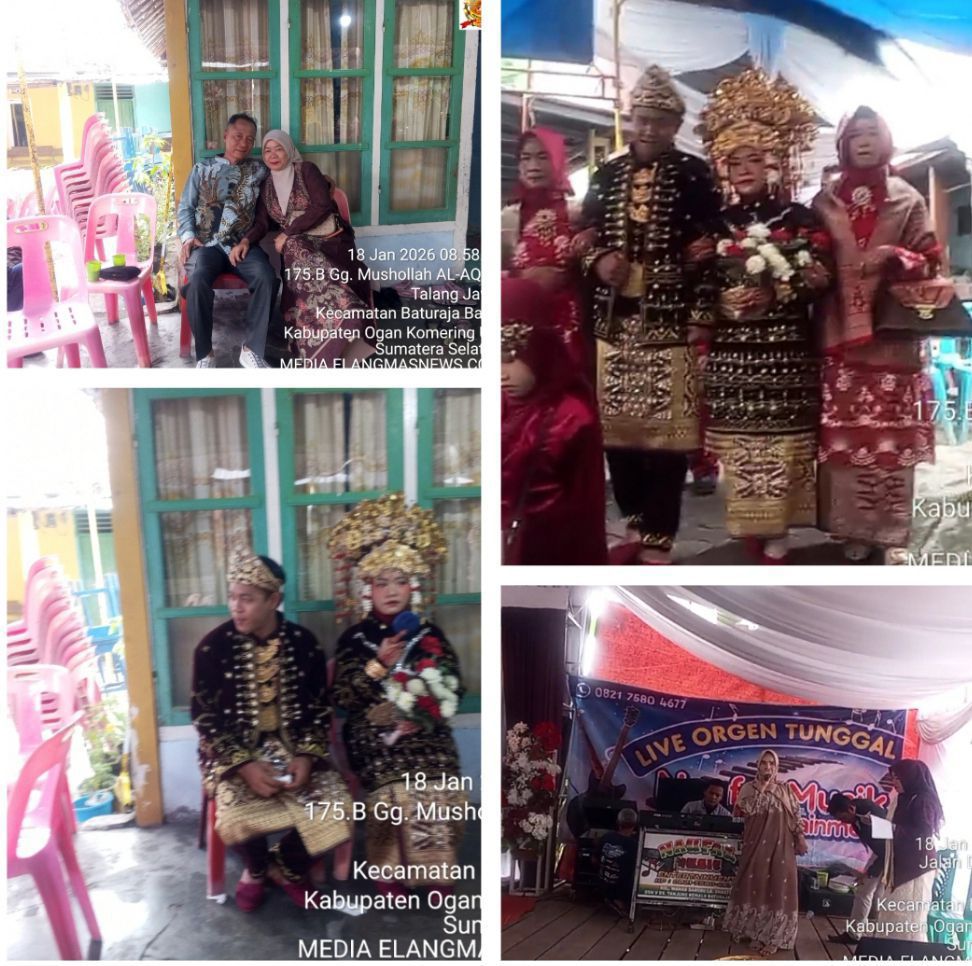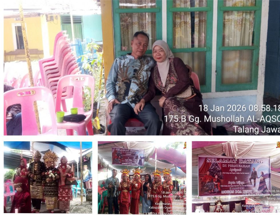 Elangmasnews.com, Baturaja, 18 Januari 2026 — Resepsi pernikahan Apriyanti binti Ponijan dengan Sapta Wijaya bin Suparman berlangsung khidmat dan meriah di kediaman orang tua mempelai wanita, Jalan Mukmin Gang AQSO 2 RW 01 RT 16 Talang Bandung, Kelurahan Talang Jawa, Kecamatan Baturaja Barat, Kabupaten Ogan Komering Ulu (OKU), Sumatera Selatan.