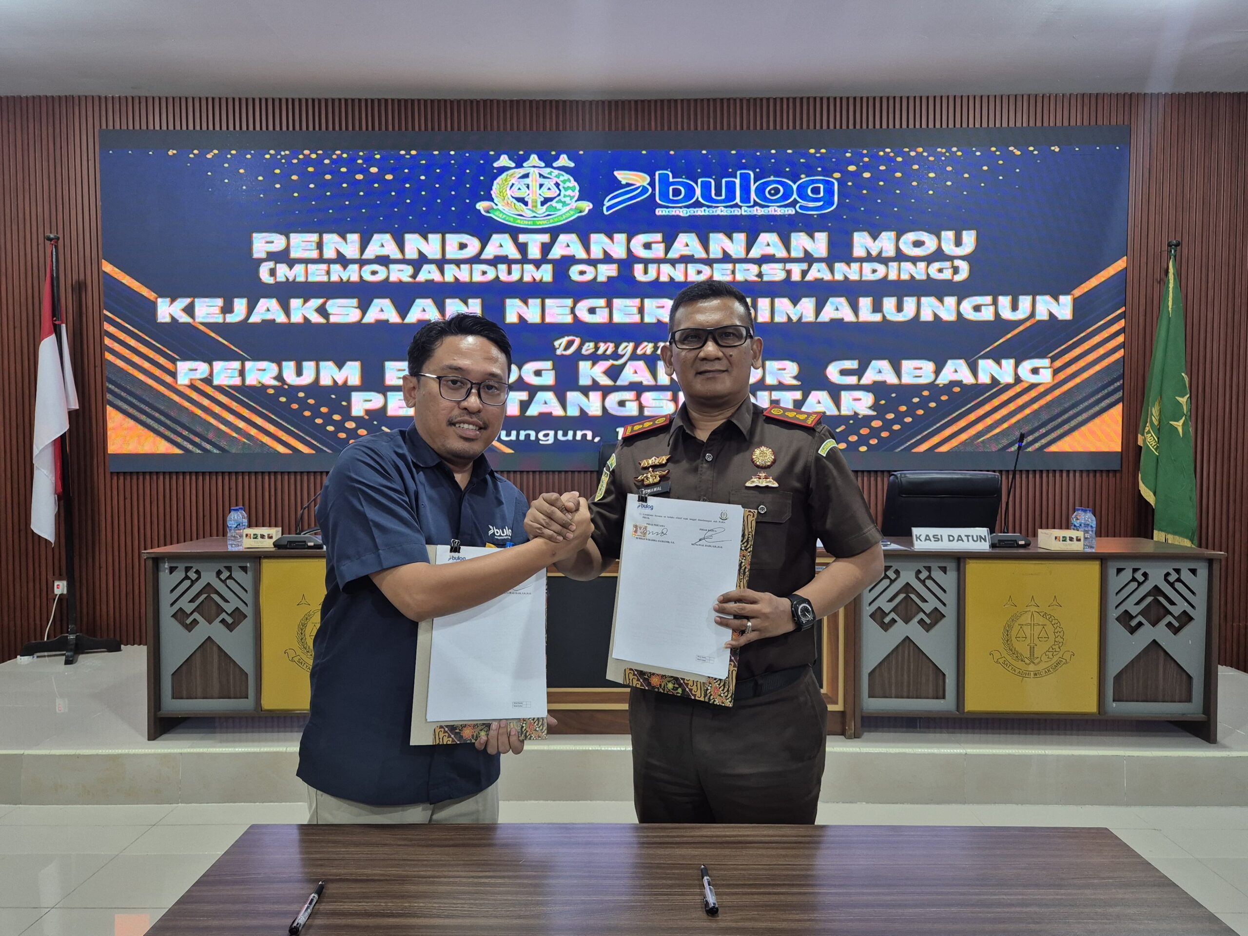Elangmasnews.com, SIMALUNGUN – Kejaksaan Negeri Simalungun resmi menjalin kerja sama hukum dengan Perum BULOG Kantor Cabang Pematangsiantar melalui penandatanganan Nota Kesepakatan (MoU) tentang Penanganan Masalah Hukum Bidang Perdata dan Tata Usaha Negara (Datun). Prosesi penandatanganan ini berlangsung khidmat di Aula Kantor Kejaksaan Negeri Simalungun, Selasa (14/04/2026).