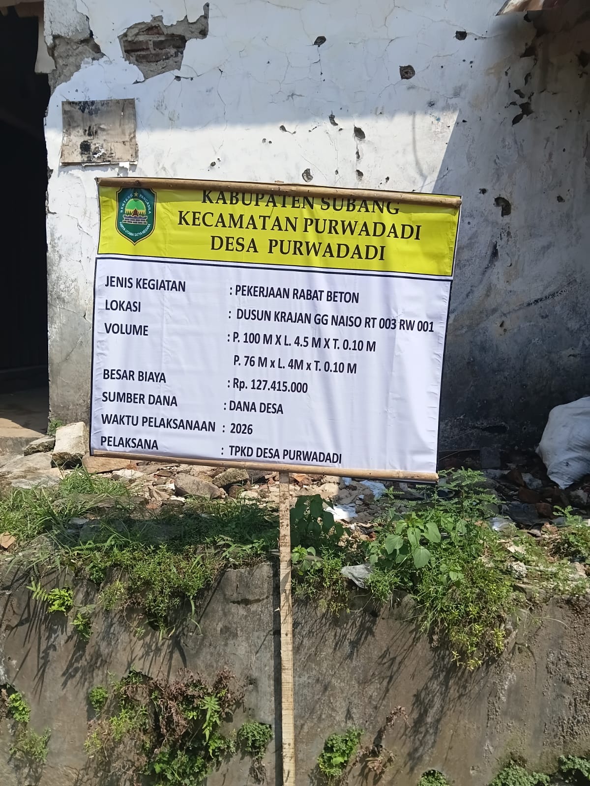 Menurut Kepala Desa Purwadadi Al – amin kepada awak media mengungkapkan, bahwa anggaran pembangunan jalan lingkungan tersebut bersumber dari Dana Desa tahun anggaran 2026 sebesar Rp 127.415.000. dengan Volume Panjang 76 M. Lebar 4,5 M, Tinggi 10 Cm.
